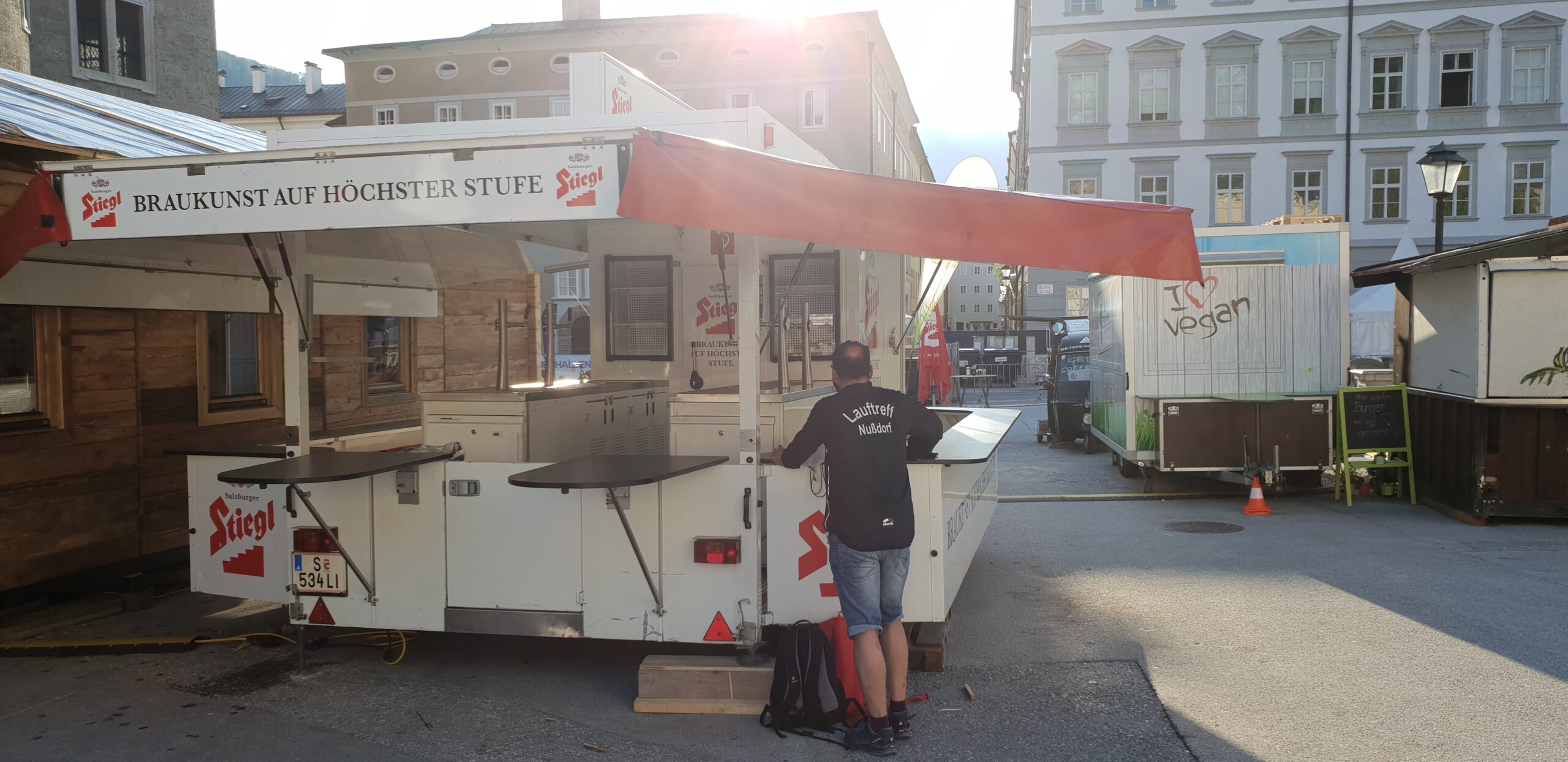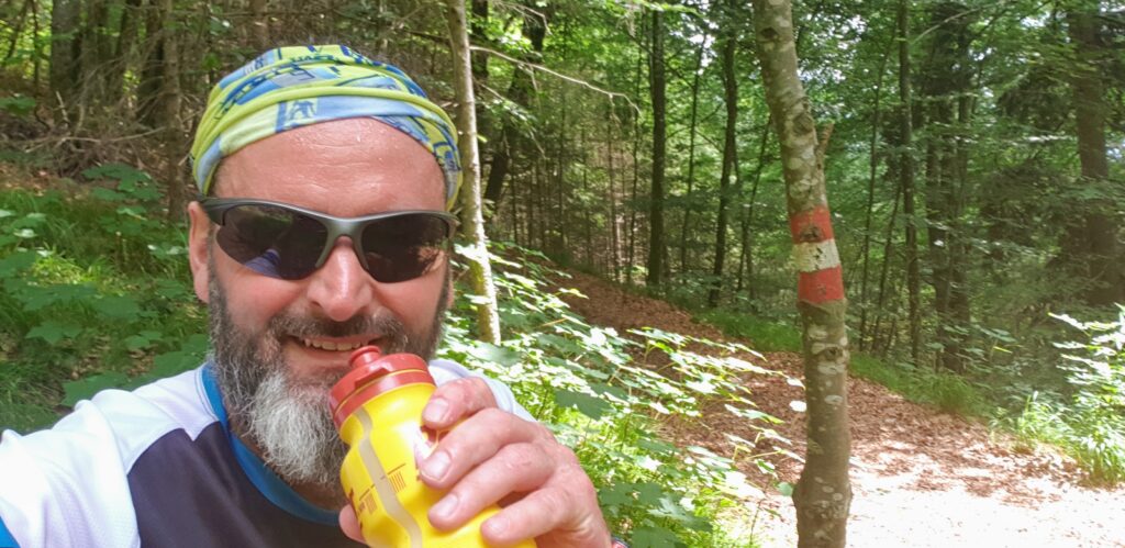 Wieder zurück in die niederen aber schönen Hügeln an der Salzach. Ich hatte mich also entschlossen mit zumachen. Ich wollte in keiner unserer Staffeln mitmachen, da ich nicht wusste was meine Beine und die Ferse vor hatten. Geht’s gut freut es das Team, geht’s schief ärgert es mich. Also einen Einzelstart. Ich war immer der Typ der meist in die Vollen geht, wenn es länger gehen kann. Kurze Sachen sind nix für mich. Da ist mir zu wenig Abenteuer. Also wählte ich die Marathon Strecke mit 42km und 1600 Höhenmeter. Das passt für den Anfang in den Wiedereinstieg in die Laufszene. Richtig lange Distanzen konnte ich zugegebener Maßen nicht vorweisen. Nur 2x im letzten halben Jahr war ich 20km am Stück unterwegs. Da werden viele schimpfen beim Lesen. „Was soll das, ohne spezielle Vorbereitung mitlaufen!“ Aber es ist mir egal. Nur nicht letzter werden war die Devise. Besser dabei als zu Hause. Ergebnisse muß ich nach 30 Jahre Laufkarriere nicht mehr liefern. Ich bin ja jetzt immer auf dem Rad unterwegs, und im Winter auf Langlaufski. Mit dem Rad fahre ich ohne Probleme 100km und noch weiter. Alles Easy, an der Ausdauer und am Willen wird es heute nicht scheitern. Ich kam rechtzeitig an den Start im Herzen der Salzburger Altstadt am Kapitelplatz. Das Wetter war herrlich sonnig aber warm. Nicht gut für Läufer aber was soll‘s, das ist für alle gleich. Ich hatte einen Trinkrucksack aber keinen Wasser Tank dabei. Ich habe den Schlauch nicht mehr gefunden. So nahm ich 3 Flaschen mit 1.5 Liter zusammen, wohl etwas zu wenig wie sich später herausstellen wird.
