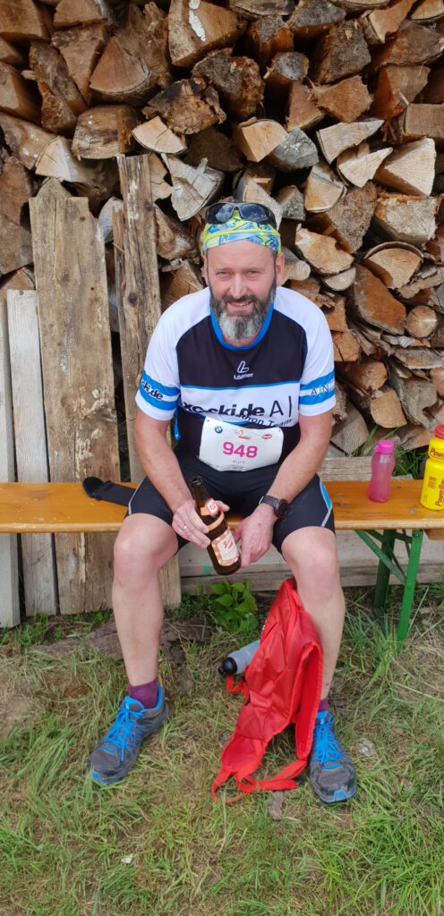 Eigentlich glaubte ich das Gebiet rund um den Gaisberg zu kennen. Aber ich sah immer wieder neue, schöne Ansichten unserer Heimat. Ich sah den Gaisberg und den Nockstein von allen Himmelsrichtungen. Aber in Griffweite waren sie nie. Im Koppler Moor wurde die Getränke Situation ernst. Es war heiß und ich hatte Durst. Ich musste schon sehr sparen. Bei kühlen Temperaturen wäre das kein Problem aber es hatte gefühlte 30 Grad – nicht lustig. Ich ging seit Km22 fast zur Gänze! Nordic Walking dahoam. Es war mir egal, ich muss nach Salzburg. Mittag war schon lange vorbei als ich zur Labstation bei KM 32 unterhalb vom Nockstein kam. Diese Labstation war ein geistiger Motivator. Einen Zeitplan hatte ich eh nicht mehr also nahm ich gerne einen Radler und trank mit Hingabe. Es war idyllisch, Kitschig. Ich saß beim Trail Marathon vorm Heustadl genoß den Radler und sah ins Salzburger Land. Perfekt.