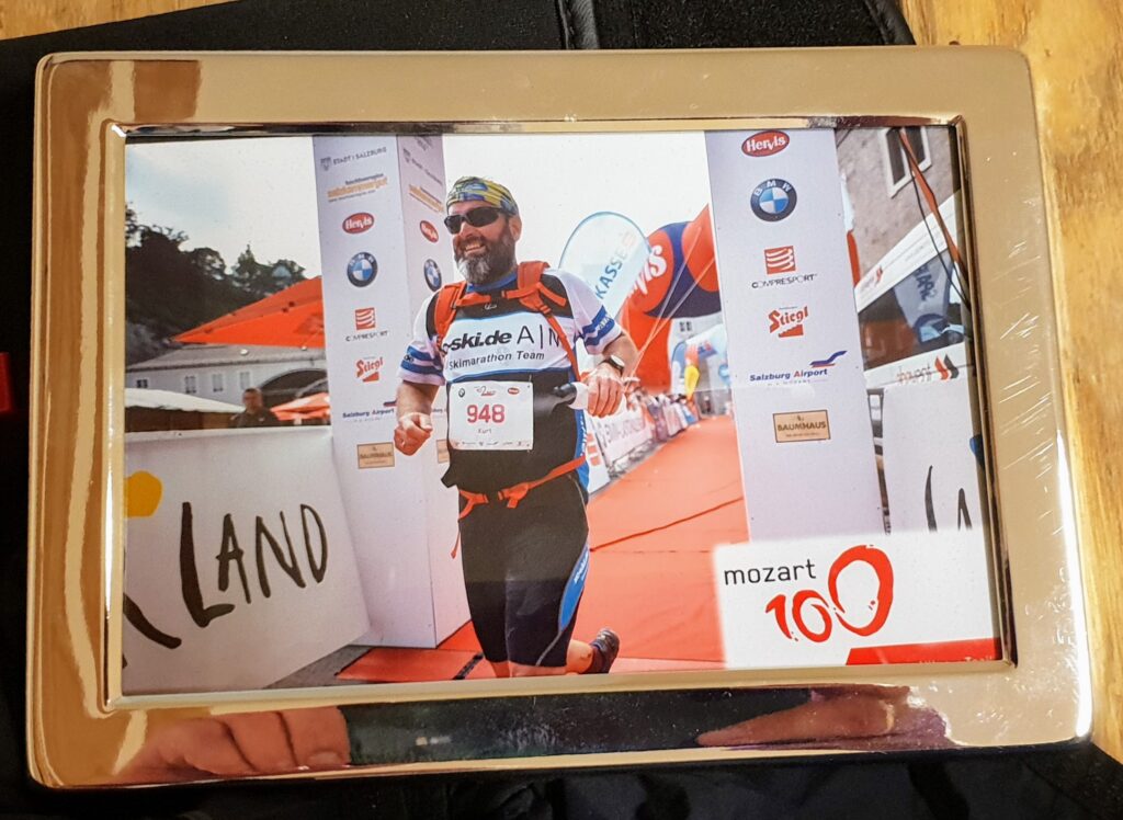 Eine nette Dame gab mir Salztabletten kurz vom KILLER Kapuzinerberg. DANKE. Sie war aber auch schneller als ich. Unendlich langsam und zitternd ging es hinunter in die Stadt. Die Staatsbrücke über die Salzach war eine Freude. Ich gab nochmal alles. Die Touristen dachten wohl ich bin 100km gelaufen und bin bärenstark. Nein es waren nur 42km. Aber die waren es wert für mich. Mit einem heißen Zielsprint „flog“ ich ins Ziel unter dem Jubel der Vereins Kollegen. Sehr nett war auch das gerahmte(!) Finisher Foto das vom Veranstalter gemacht wurde und von fleißigen Helfern überreicht wurde!