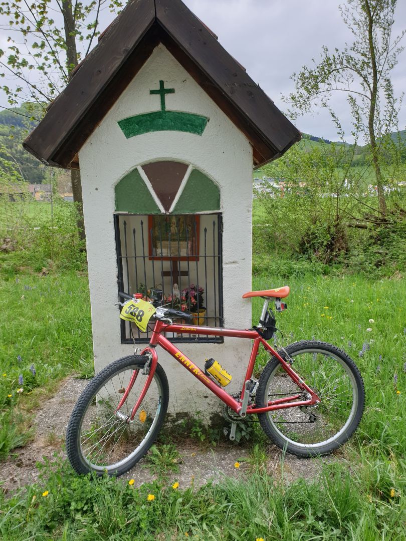 Laut meiner Uhr bin ich schon nahe dem Ziel, 5 Kilometer noch. Die ziehen sich aber gewaltig. Immer wieder auffi und obi. Beim letzten Downhill auf Asphalt (wir sind wieder in der Zivilisation) spüre ich immer ein Motorrad hinter mir. Das laute Brummen macht mich unrund. Bin ich letzter? Bin ich so langsam? Jein. Denn ich rette meinen Vorsprung vor dem Motorrad über die Ziellinie! Ich beende das Rennen kurz bevor der Sieger, der doppelt so langen Strecke, ins Ziel kam. Na – der war ja auch jünger 🙂