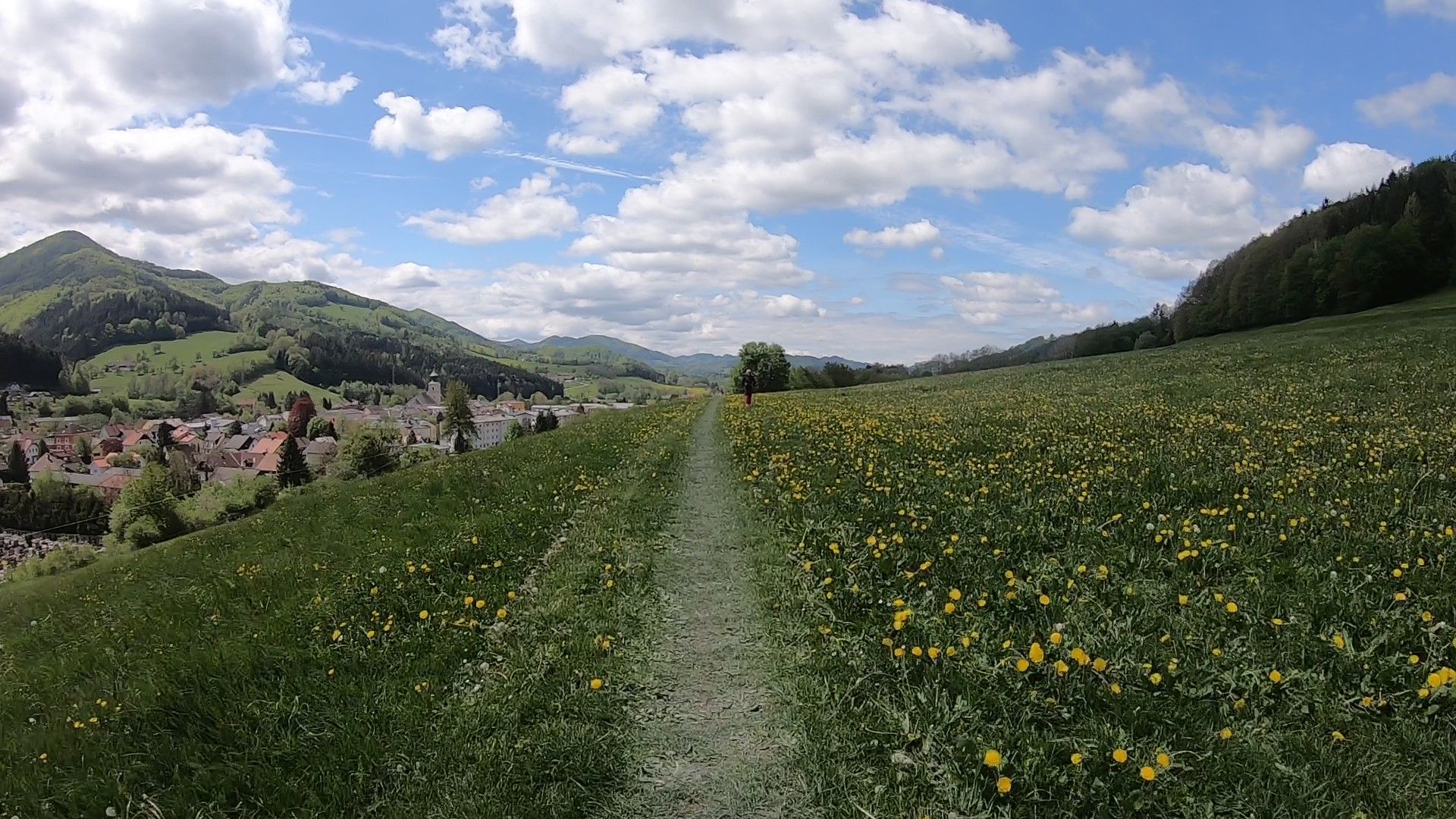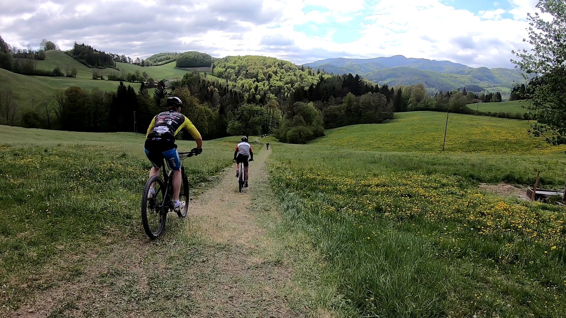 Ich reihte mich sicherheitshalber ganz hinten ein. Unter den bunten aktuellen Rennmaschinen sah mein Ofen ziemlich alt aus. Zurecht wie sich zeigen sollte. Ganz hinten im Feld hat aber auch Vorteile. Der schönste ist das man viele überholen kann. Eine Weile zumindest. Der zweite ist auch schön, aber nicht Leistungsfördernd. Man kann nette Damen sehen die langsamer sind, vermeintlich. Ich starte los mit meinem 70 Euro Rad (gebraucht gekauft im Herbst) und überhole auch wirklich viele. Das teuerste am Rad waren meine beiden Action Cams 🙂 vorne eine GoPro 7 Black, unterm Sattel eine Garmin Virb Ultra 30, welche leider versagte und keine Bilder lieferte. Um den Preis der Kameras kann man sich ein modernes Rad kaufen. Tat ich aber nie, für mich war und ist immer noch der Sport wichtiger. Und eben die Dokumentation der Sport Events. Etwas mehr als 200 Starter gehen auf die kurze (30km) lange Strecke. Kurz nach dem Start kommt gleich die erste Steigung. Ich überhole viele Teilnehmer die ein modernes Rad haben, dass macht mich zuversichtlich. Bergauf kann ich mich schinden. Das Wetter war auch angenehm kühl. Als die erste Abfahrt kommt, kommt auch der erste Rückschlag für die Moral. Es geht über eine sehr holprige Wiese runter. Ja ich weiß das gehört zu einem MTB Rennen, aber ohne wäre es mir lieber. Ich kann mich kaum am Rad halten, so arg werde ich durchgeschüttelt. Ohne Federung geht heutzutage also gar nix mehr. Ich nehme es zu Kenntnis. Genauso wie, dass mich jetzt die Damen überholen die ich eigentlich hinter mir eingestuft hatte. Auch die, die ausgesehen haben als würden sie Sport nur vom Volkshochschulkurs kennen. Ja ihr Damen ihr habt mir oder besser gesagt meinem Material die Grenzen aufgezeigt. Die Sportler überholten mich als schwebten sie über Stock und Stein. Da war ich schon ein bisschen neidisch.