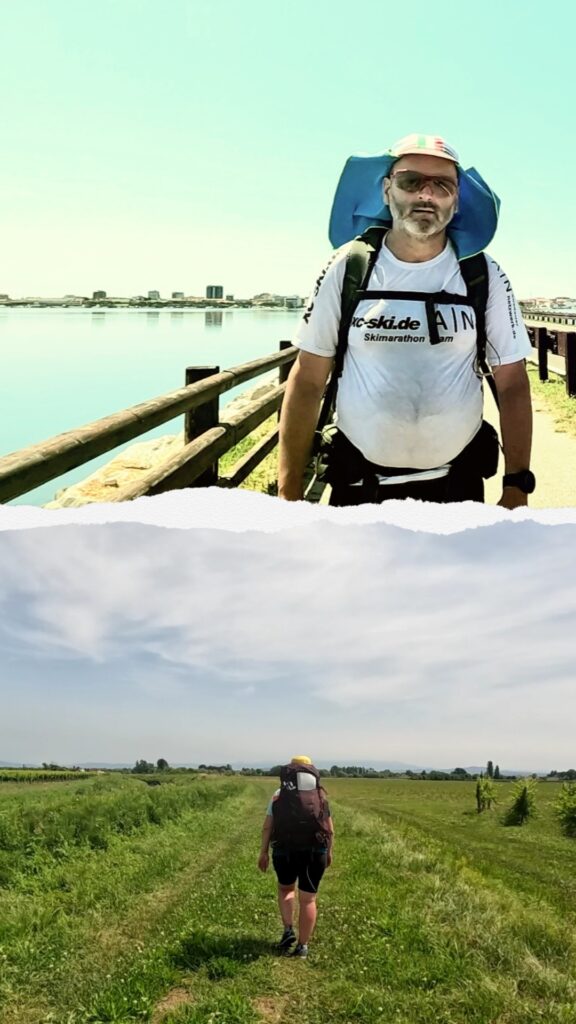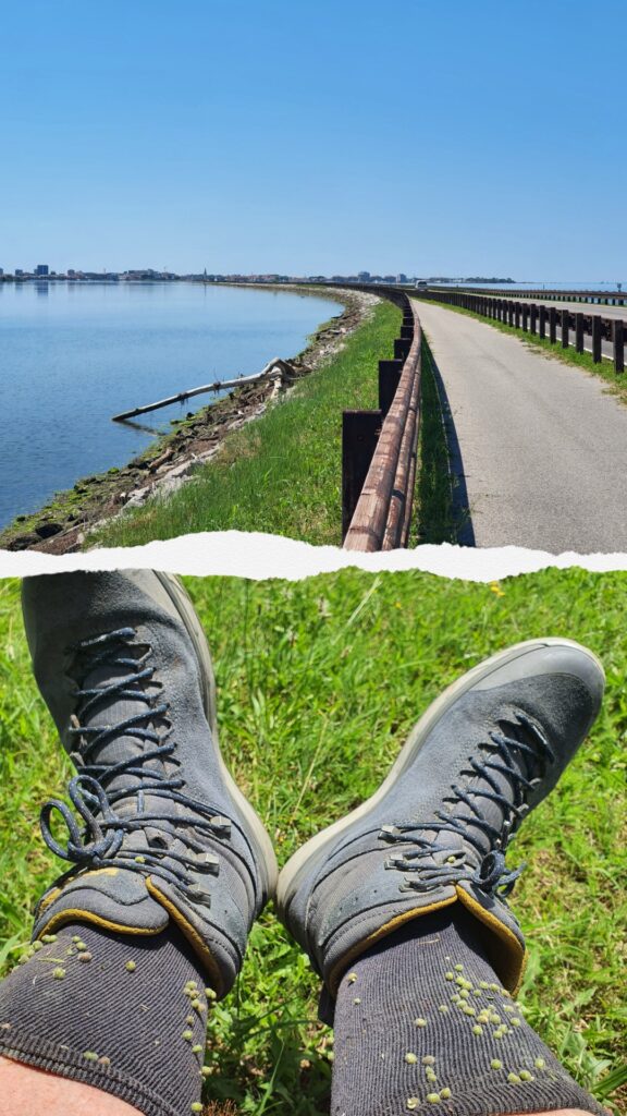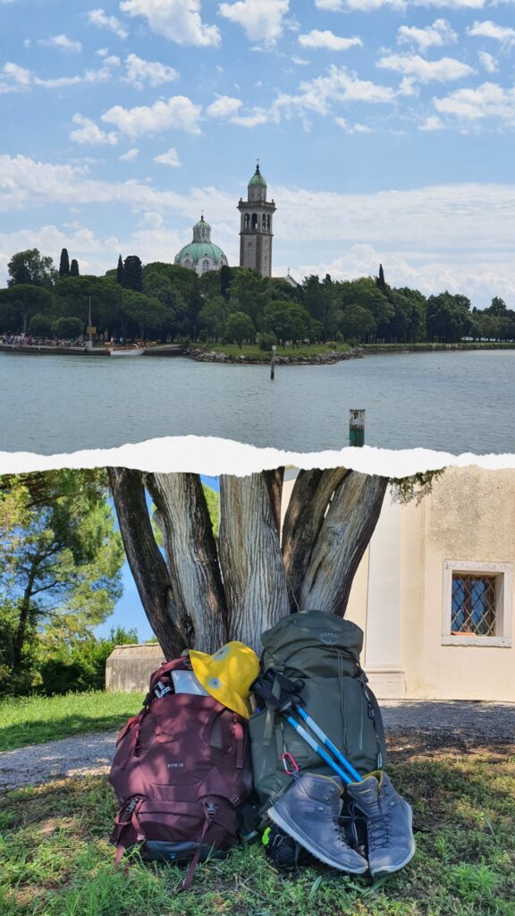 Wir starteten an einem Samstag frühmorgens Mitte Juni mit Zug von Salzburg nach Villach. Dann weiter mit einem AlpeAdria Microta Zug bis nach Cervignano. Zu Mittag wechselten wir dort in einen Bus und weiter gings nach Grado. Hier gönnten wir uns zwei Tage ein einfaches Hotel und genossen Grado. Am Montag gings dann los auf die Erste Etappe, ein Prolog um genau zu sein. Der Weg geht im Original von der Insel Barbana in der Bucht von Grado los. Den Pilgerpass holten wir uns tags zuvor mit dem Boot. Dort hätte man auch schlafen können, mangels Informationen wussten wir davon aber nichts, auch von vielen anderen Neuigkeiten oder Wissenswerten über den Pilgerweg wussten wir oft nichts.