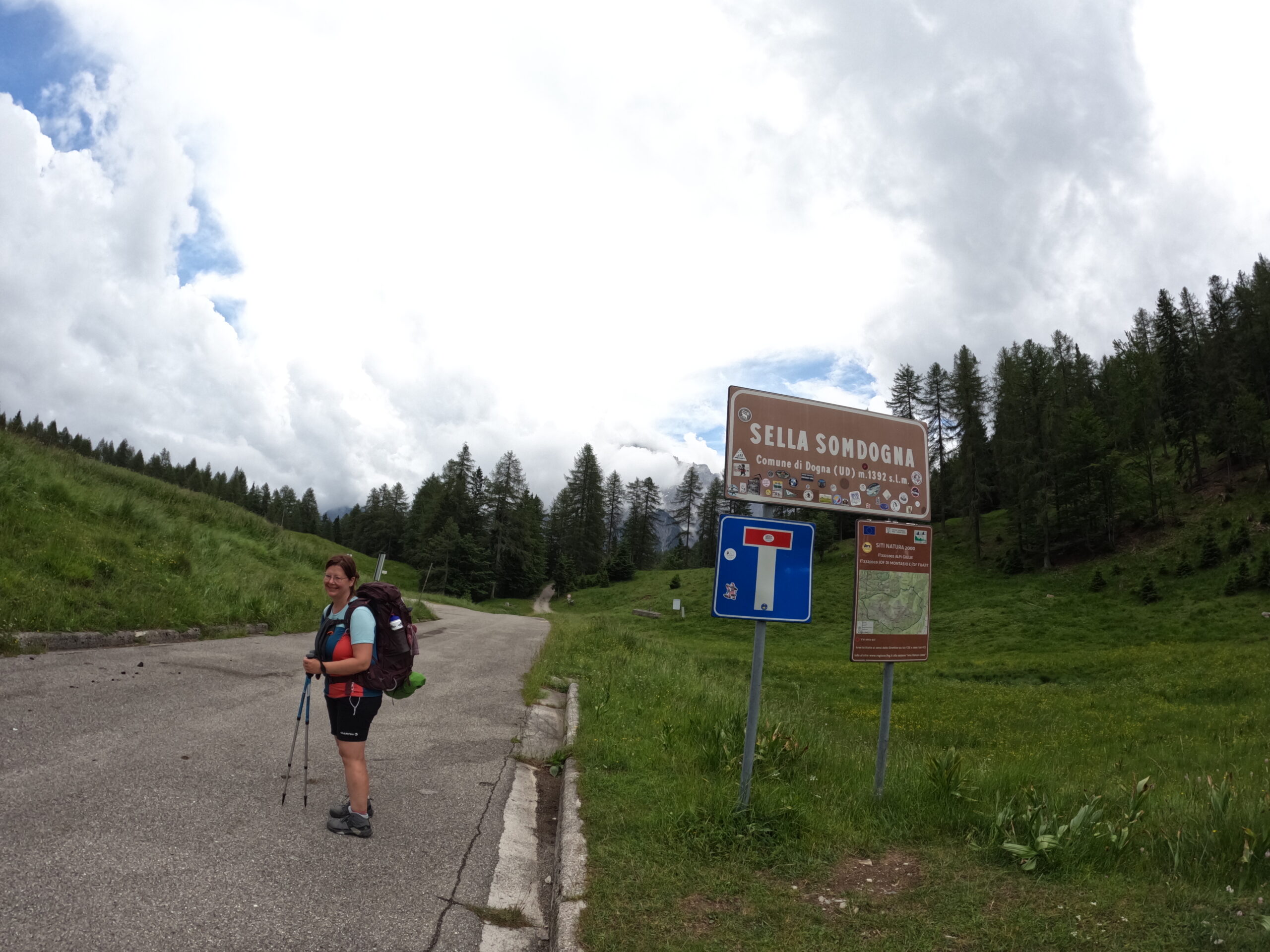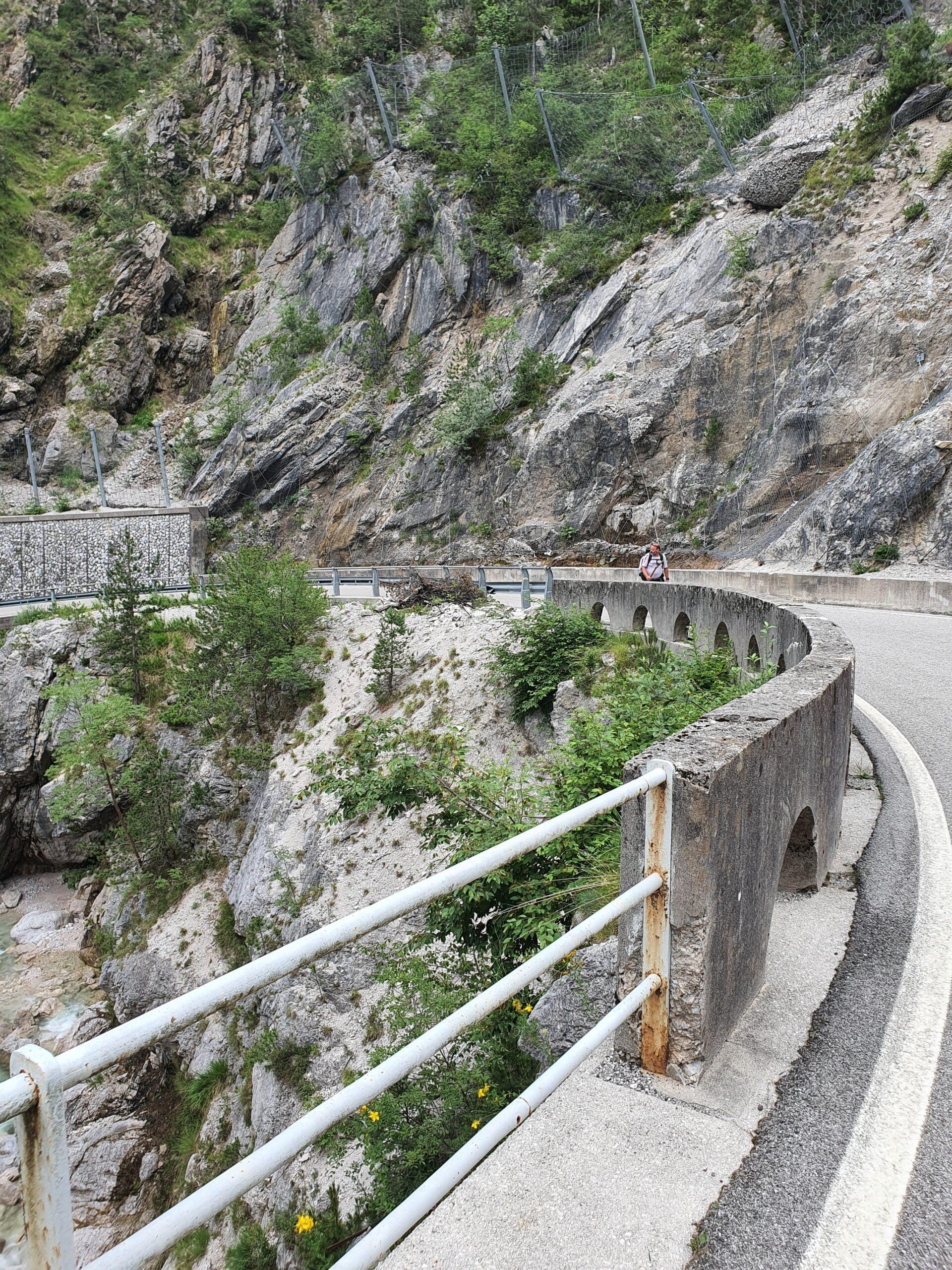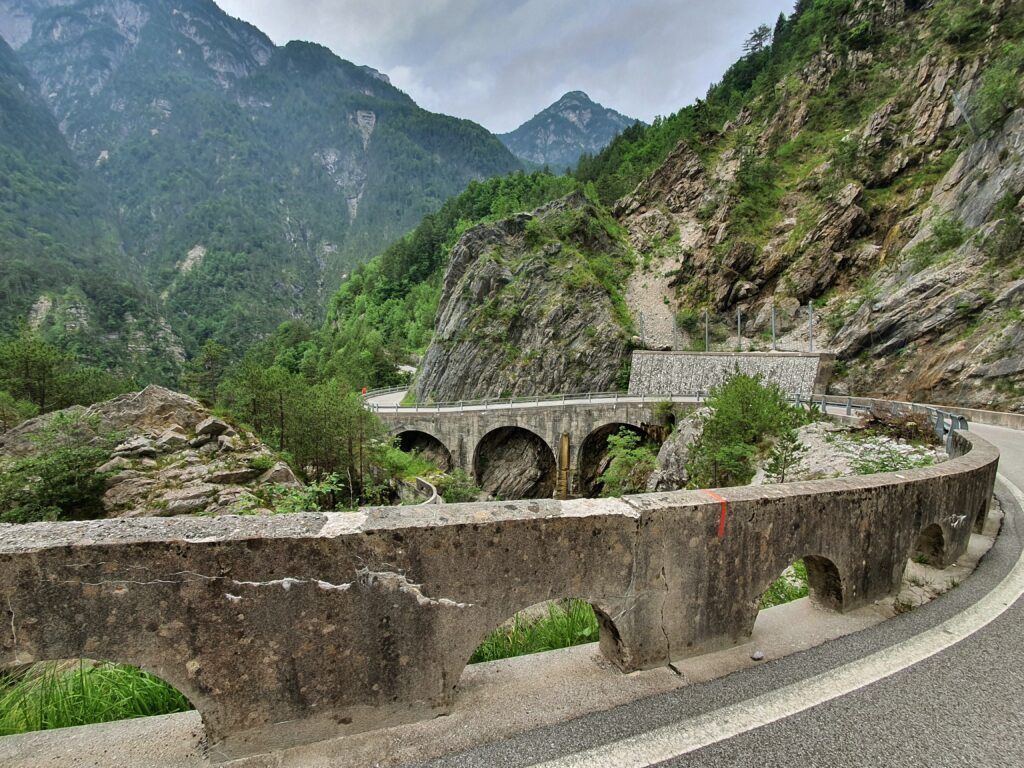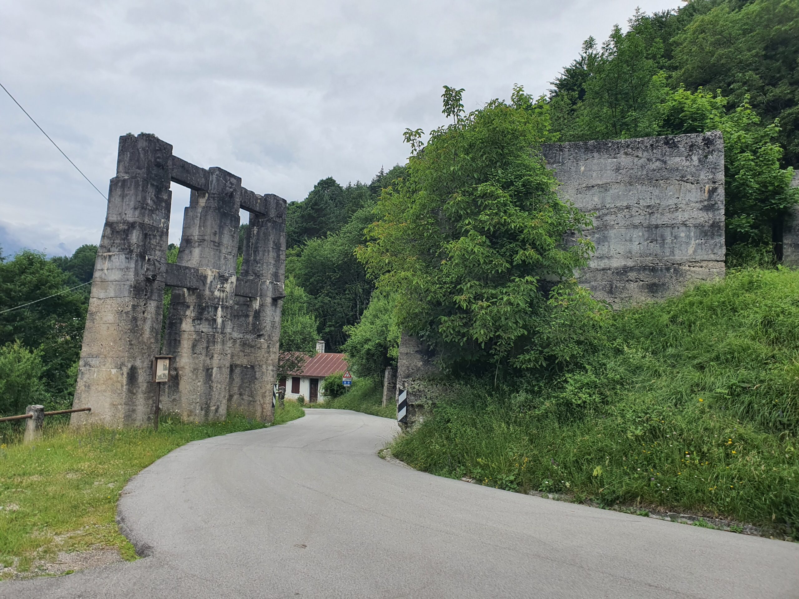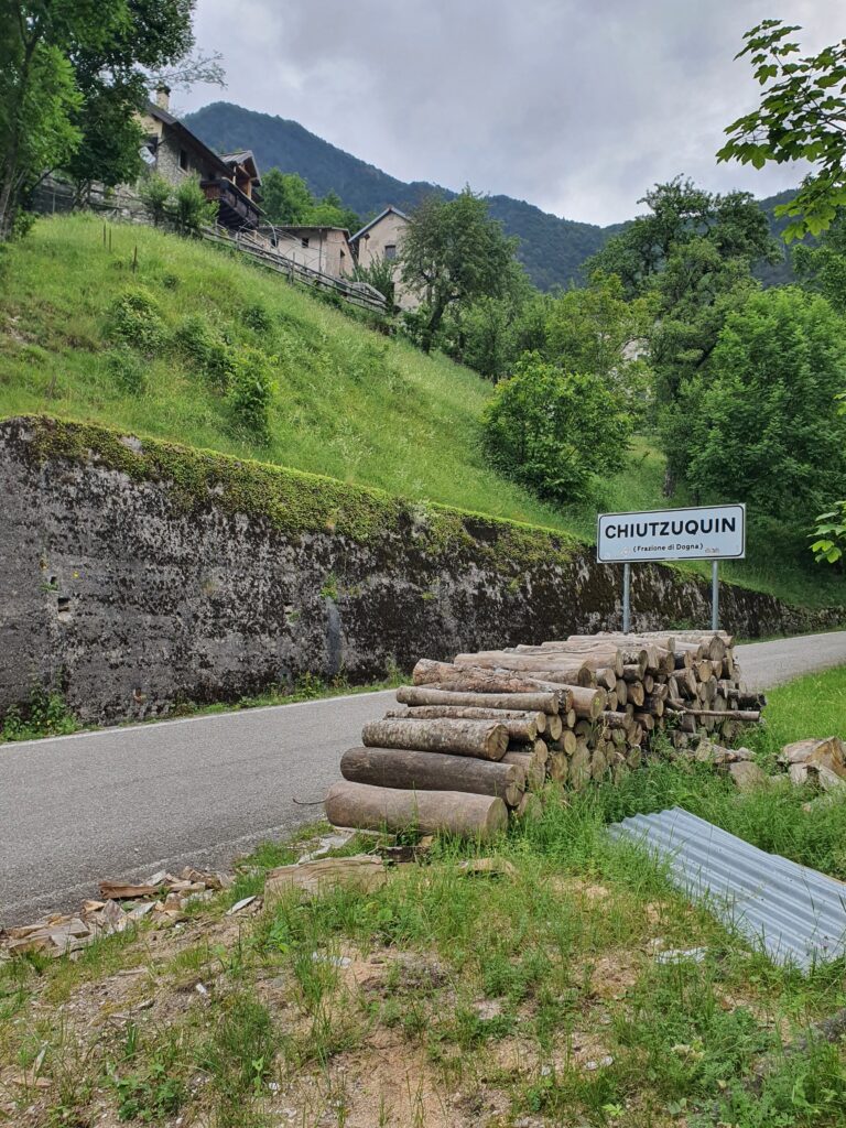 Mit einem eher trockenen Frühstück aus Keksen, Zwieback und Tee geht es um halb acht Uhr los. Dogna hatte zu Beginn des 20. Jahrhunderts 1500 Einwohner, heute sind es nur noch 175. Dies ist oft so in dieser Gegend. Nach den Kriegen begann die große Abwanderung aus den Orten. Und so gehts auch einsam auf einer alten Militärstraße durch das grüne Dogna Tal rauf zum Sella di Somdogna Pass (1400 m), weiter zum Rifugio Grego und dann bergab ins Bergsteiger Dörfchen Valbruna. Wir starten relativ steil die ersten Kilometer. Bei KM2 eine größere Siedlung, ab dann wirds ruhig. Wir sind aber eh beeindruckt von der Brückenbaukunst, mit der die Straße sich das Tal hoch schlängelt. Wir sind aber noch mehr in den Bann gezogen von den Überresten des Ersten Weltkriegs. Hier war eine Frontlinie und es wurde zwischen Österreich und Italien hart und blutig gekämpft. Überall alte Bauwerke und Ruinen zeugen von traurigen Stunden. Nach fast 3 Stunden wieder eine Siedlung, mit dem unaussprechlichen Namen Chiutzuquin. Wir hören Geräusche, sehen aber keinen Menschen. Im Internet lesen wir das hier nur im Sommer, wer lebt. Wir gehen zahllose Schleifen und Kehren, es regnet etwas. Wir nehmen es als willkommene Abwechslung. Noch 2 Stunden später ändert sich die Landschaft. Es wird steiler, eine Alm taucht auf. Urlaub auf dem Bauernhof, weit weg von der Zivilisation. Angesichts der noch verbleibenden Strecke kehren wir dort aber nicht ein. Sabine ist schon etwas müde, der Tag zieht sich.
