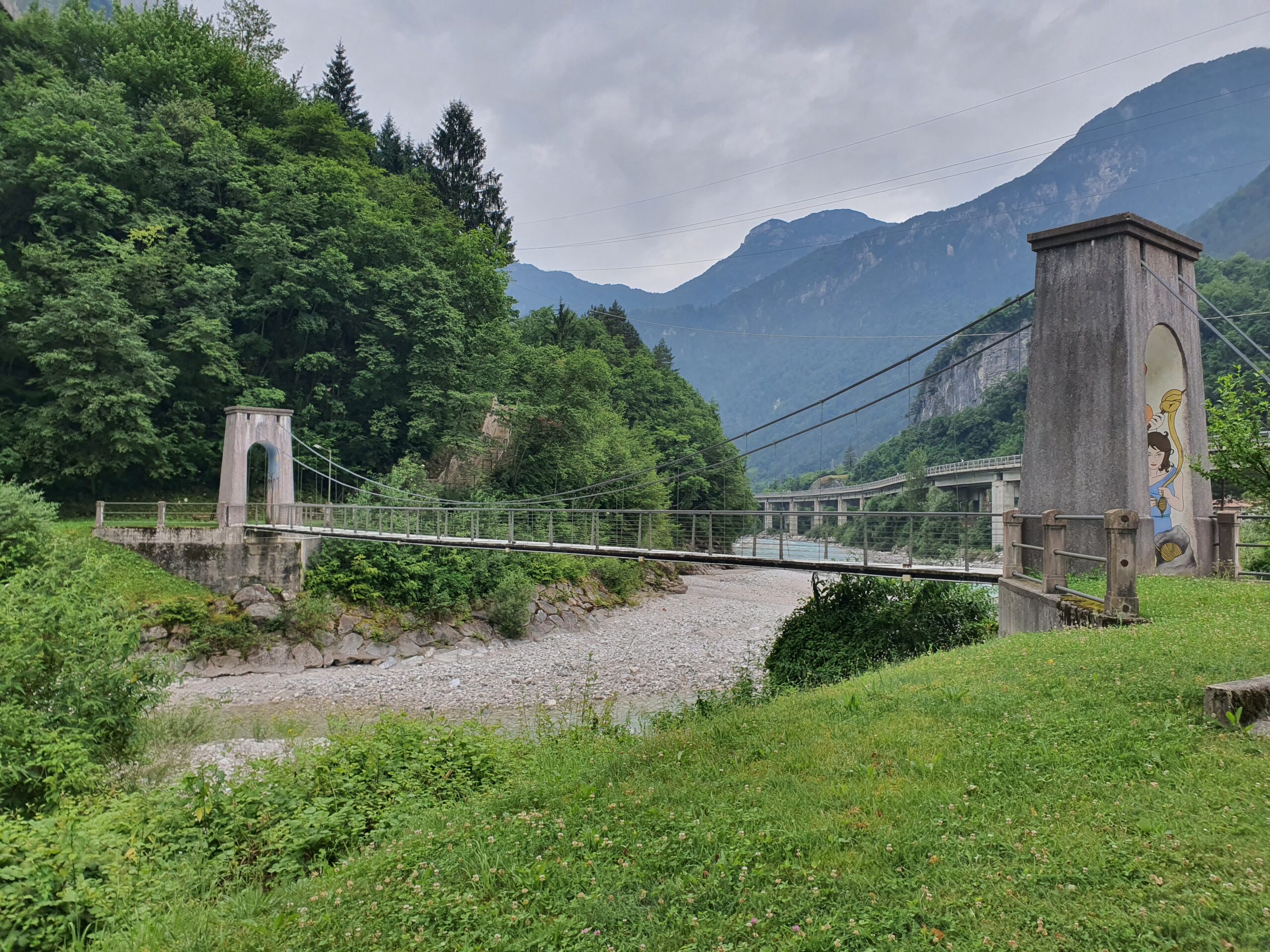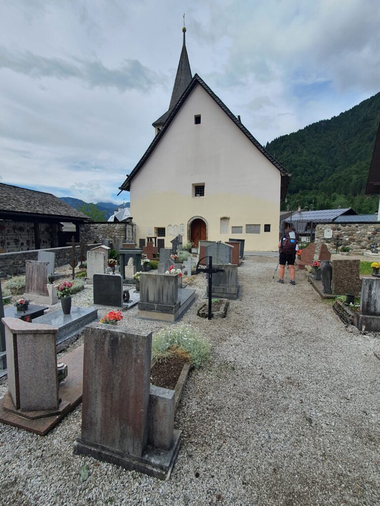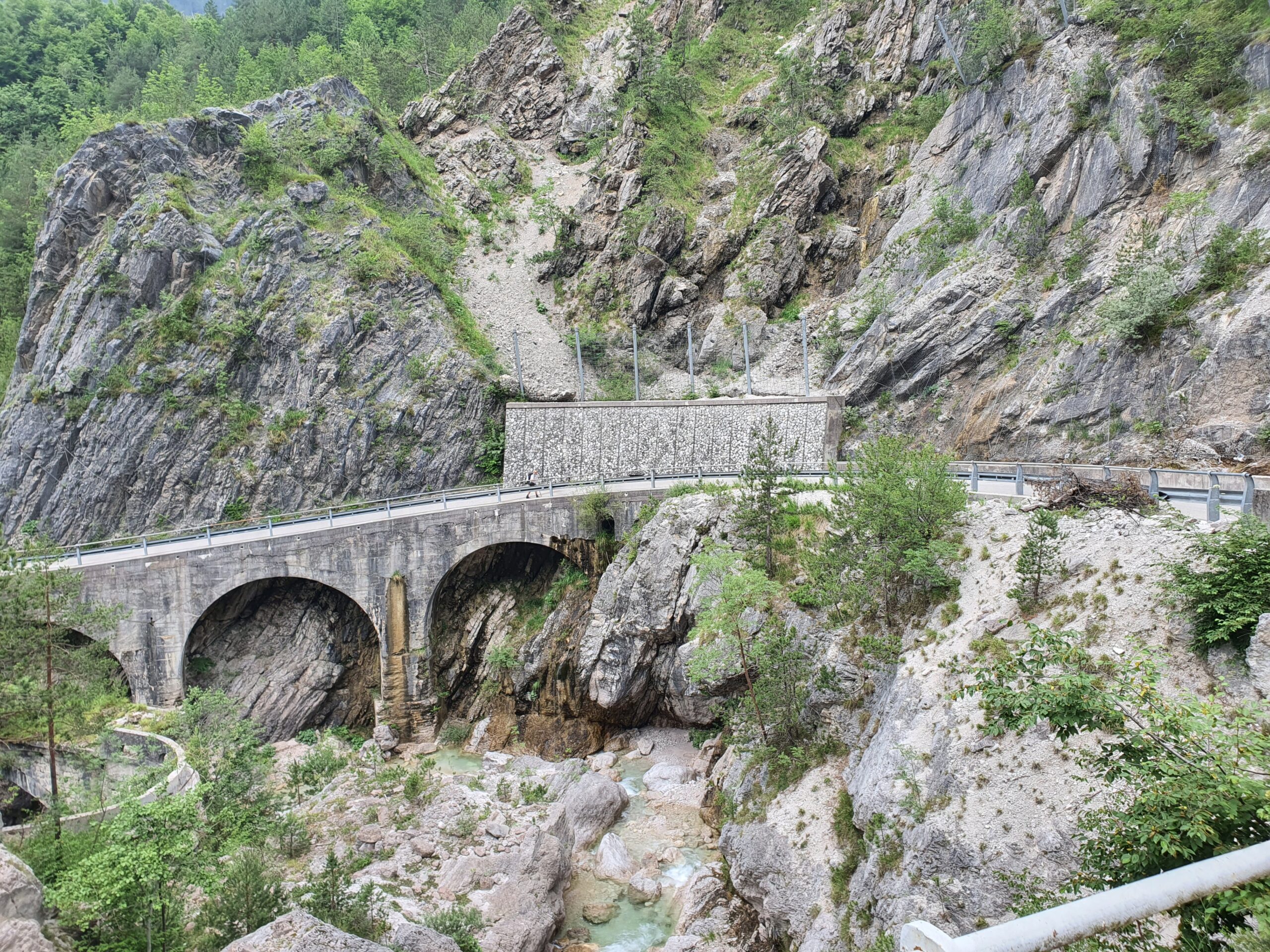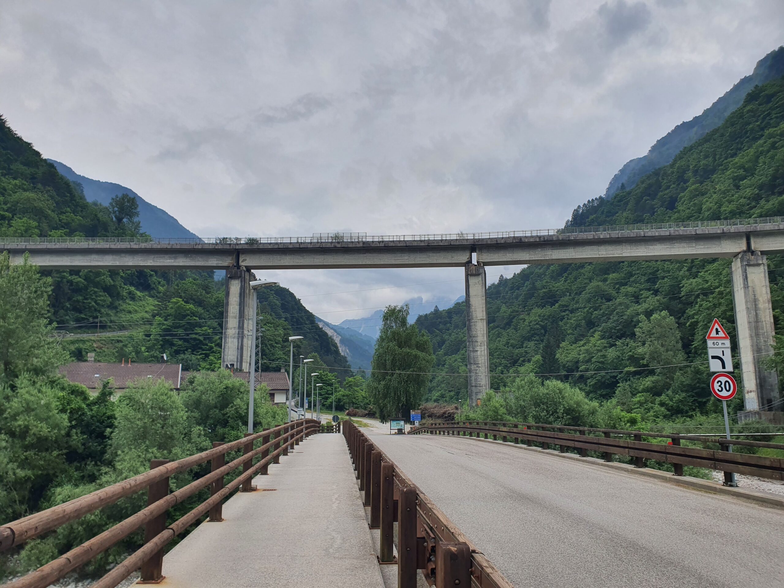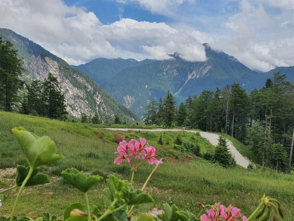 Mit einem eher trockenen Frühstück aus Keksen, Zwieback und Tee geht es um halb acht Uhr los. Dogna hatte zu Beginn des 20. Jahrhunderts 1500 Einwohner, heute sind es nur noch 175. Dies ist oft so in dieser Gegend. Nach den Kriegen begann die große Abwanderung aus den Orten. Und so gehts auch einsam auf einer alten Militärstraße durch das grüne Dogna Tal rauf zum Sella di Somdogna Pass (1400 m), weiter zum Rifugio Grego und dann bergab ins Bergsteiger Dörfchen Valbruna. Wir starten relativ steil die ersten Kilometer. Bei KM2 eine größere Siedlung, ab dann wirds ruhig. Wir sind aber eh beeindruckt von der Brückenbaukunst, mit der die Straße sich das Tal hoch schlängelt. Wir sind aber noch mehr in den Bann gezogen von den Überresten des Ersten Weltkriegs. Hier war eine Frontlinie und es wurde zwischen Österreich und Italien hart und blutig gekämpft. Überall alte Bauwerke und Ruinen zeugen von traurigen Stunden. Nach fast 3 Stunden wieder eine Siedlung, mit dem unaussprechlichen Namen Chiutzuquin. Wir hören Geräusche, sehen aber keinen Menschen. Im Internet lesen wir das hier nur im Sommer, wer lebt. Wir gehen zahllose Schleifen und Kehren, es regnet etwas. Wir nehmen es als willkommene Abwechslung. Noch 2 Stunden später ändert sich die Landschaft. Es wird steiler, eine Alm taucht auf. Urlaub auf dem Bauernhof, weit weg von der Zivilisation. Angesichts der noch verbleibenden Strecke kehren wir dort aber nicht ein. Sabine ist schon etwas müde, der Tag zieht sich.