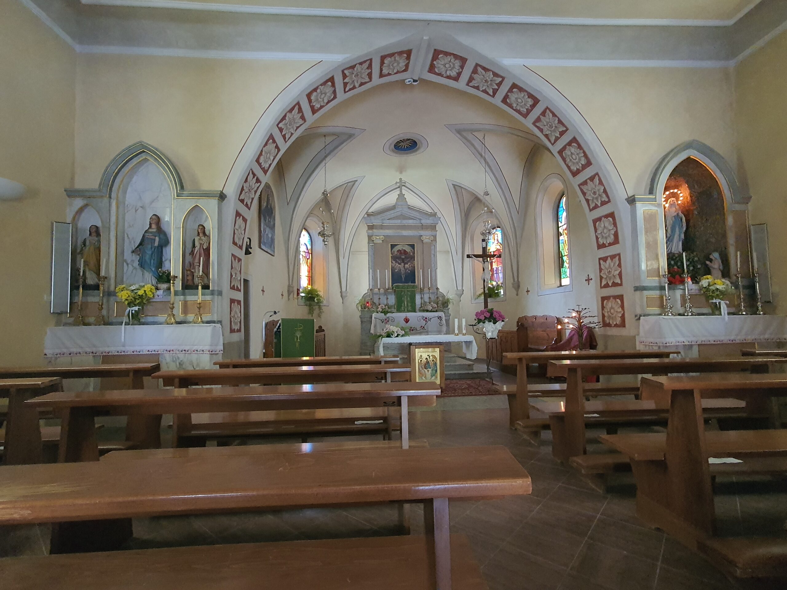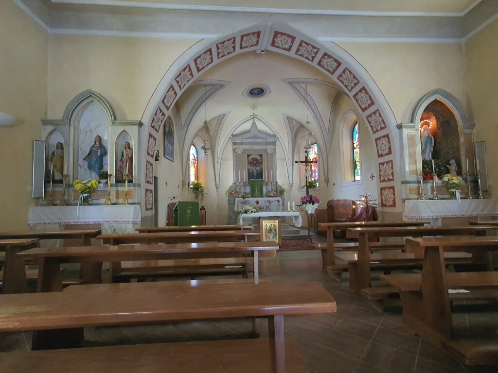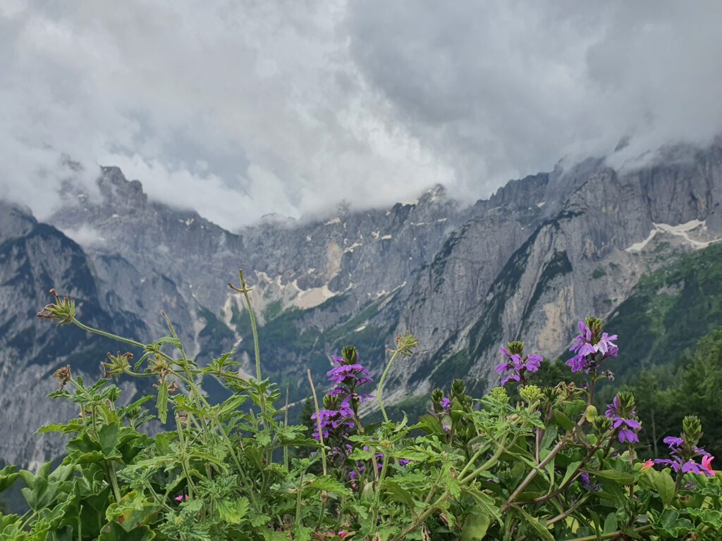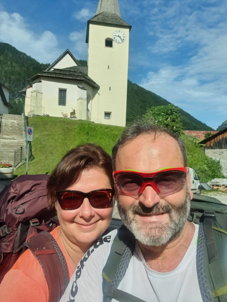 Mir fehlt auch die Phantasie für einen Scherz. Kurz nach Mittag erreichen wir die Passhöhe am Sella di Somdogna und das naheliegende Rifugio Fratelli Grego, eine Hütte traumhaft auf einen Felsvorsprung gelegen mit großem Panorama auf die Nordwand des 2754m hohen Jof di Montasio. Wir trinken ein Bier und essen eine Suppe. Wir rasten uns kurz aus, Füße lockern, wir haben noch den Abstieg vor uns. Das Wetter ist leicht bewölkt und zwischen in einem Wolkenfenster erblicken wir auf der anderen Talseite unser Ziel. Den Monte Lussari. In der Ferne erkennen wir sogar das Kloster. Wir wissen nicht, ob wir uns freuen sollen oder weinen. Schließlich ist morgen unsere Reise zu Ende. Wir verlassen die Hütte guten Mutes auf dem Forstweg, den steilen Bergpfad ersparen wir uns. Nach 2 Stunden sind wir endlich im Tal, das Navi setzt aus. Wir können schwer einschätzen, wie lange es noch dauert. Wir gehen langsam die langweilige Asphalt Straße talauswärts. Sabine hadert mit dem Knie. Mir ist es auch schon mal besser gegangen. Nach 9 ½ Stunden erreichen wir endlich Valbruna. Wir gehen zuerst in ein Hotel am Ortsrand, wir sehen Menschen auf der Terrasse, wir wollen uns mit einem Bier belohnen. Leider ist es nur für Hotel Gäste offen. Wir latschen weiter, sehen nur Ferienwohnungen, aber keine Restaurants. Unser Hotel ist klein aber fein. Wir trinken endlich Bier und haben Hunger. Etwas enttäuscht sagt uns die Kellnerin, dass es “nur” ein Focaccia gibt. Es ist eigentlich nur ein B&B. Da wir ja wieder in der Zivilisation sind, dachten wir schon an eine Speisekarte mit ein paar Gerichten. Wir trinken also die Kalorien. Die Suche nach dem Stempel war wieder langwierig. Ein anderes Hotel im Ort gab uns dann den Stempel etwas genervt. Mit einem Glas Rotwein sinken wir ins Bett.