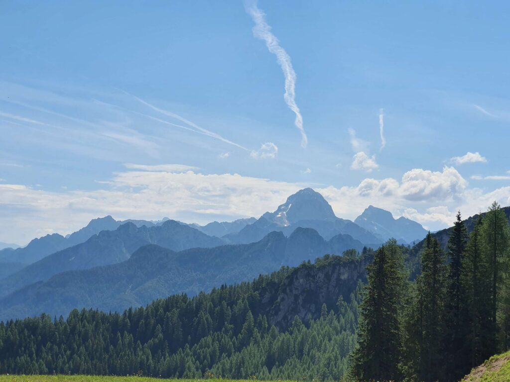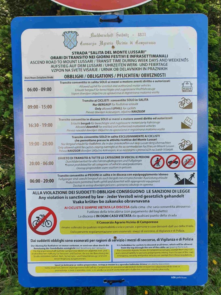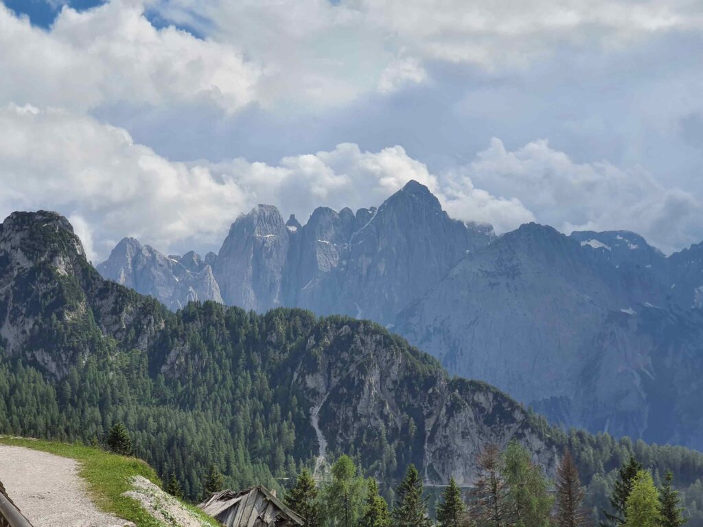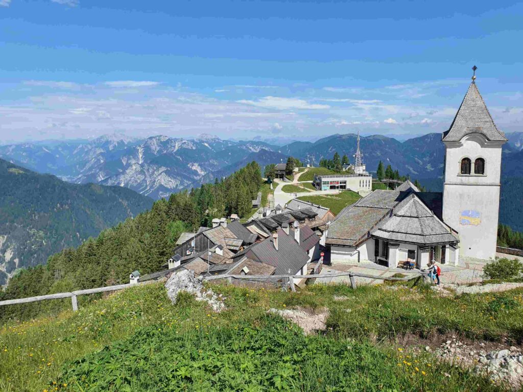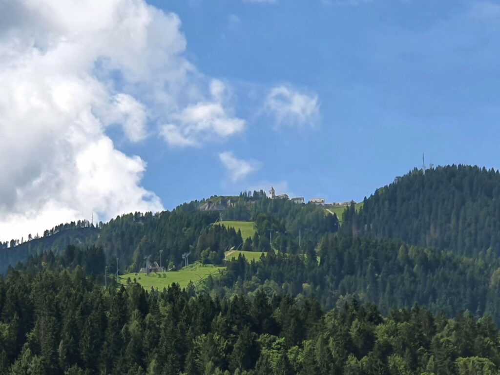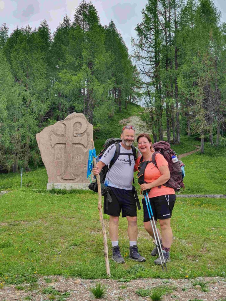 Mit einem lachenden und einem weinenden Auge beginnt der Tag. Die Sonne scheint, was willst du mehr. Wir gehen leicht ansteigend Richtung Tarvis auf dem Alpe Adria Radweg. Nach einer Stunde sind wir im nächsten Ort Camporosso, laut Pilger Plan soll es irgendwo einen Stempel geben, wir finden nichts und gehen zur Seilbahn des Monte Lussari. In der Talstation gibts auch keinen Stempel, aber Bier. Sabine musste ich lustiger Weise überreden zu einem 11er Bier. Wir liegen in einem Liegestuhl an der Schirmbar und blicken nach oben. Irgendwie ist alles komisch heute. Kein Wunder, wenn eine so lange Reise zu Ende geht. Wir schultern ein letztes Mal unseren Rucksack. Wir müssen nach oben. Der Weg ist sehr, sehr steil. Es ist zumindest ein Forstweg, so muss man nicht ganz so aufpassen. Nach 3 Stunden erreichen wir eine Alm. Sie liegt an einer Skiabfahrt im kleinen Skigebiet am Monte Lussari ist. Klein, aber sehr selektiv. Sogar Weltcup Rennen wurden schon mal ausgetragen. Wir wandern weiter sehr steil aufwärts und bewundern den Hüttenwirt, wie er mit einem Jeep die Pist rauf und runter zur Alm fährt. Nach kurzer Zeit treffen wir auf die asphaltierte Bergstraße. Diese wurde 2023 anlässlich einer Bergankunft des Giro Italia erstmals geteert. Das Rennen sah ich damals im Fernsehen. Ein großer Zweikampf damals zwischen dem Slowenen Primoz Roglic und dem Engländer Geraint Thomas. Roglic siegte unter tosenden Beifall tausender Fans aus seiner Heimat.