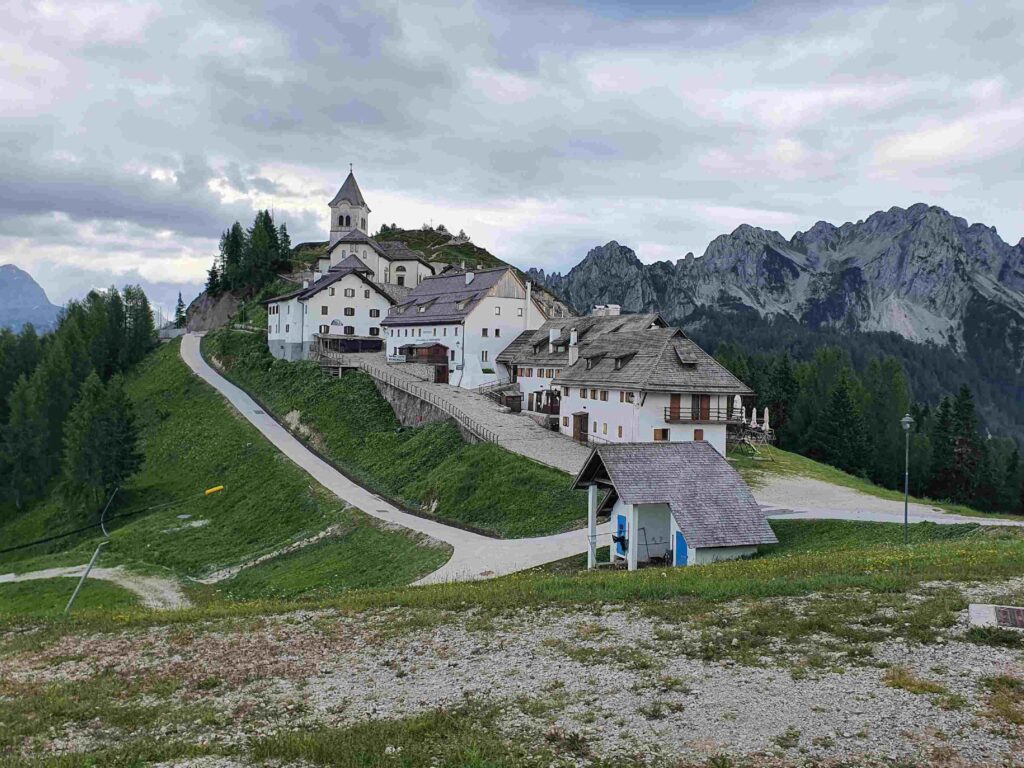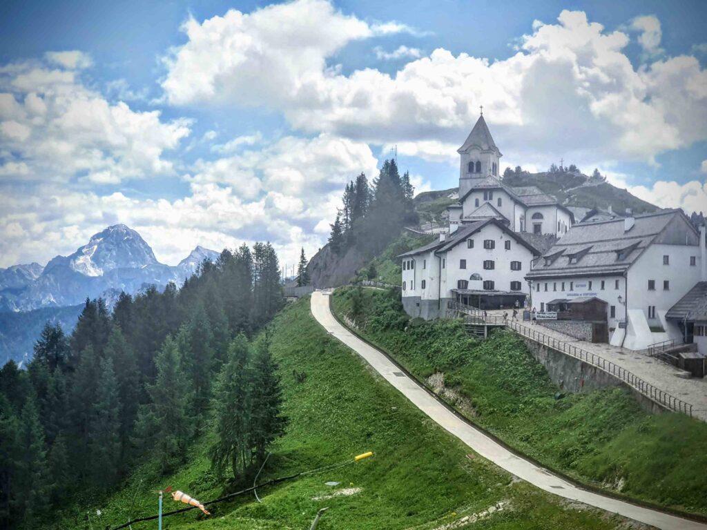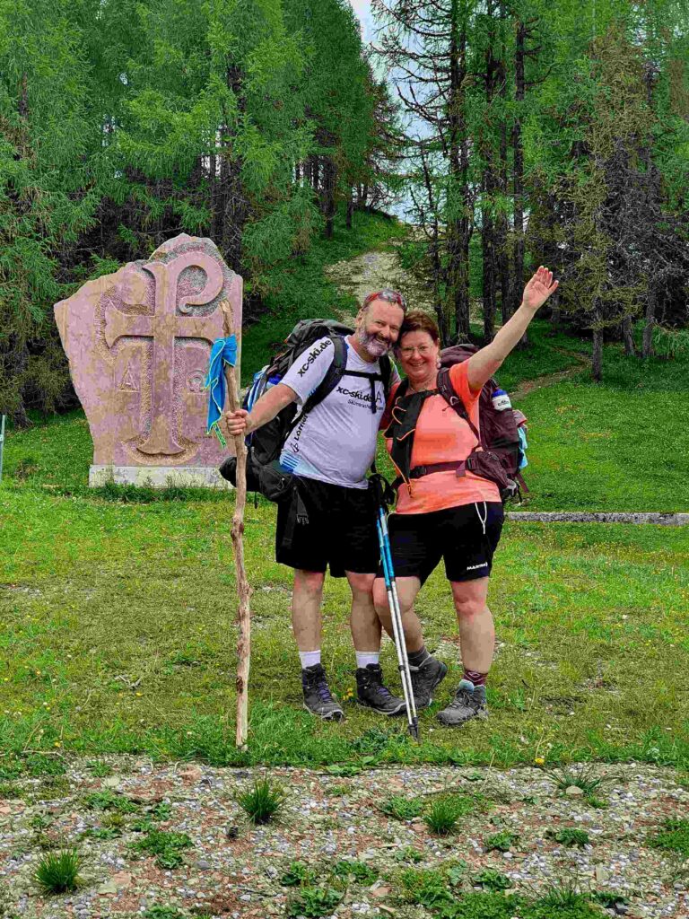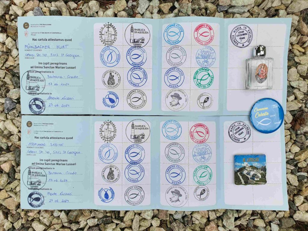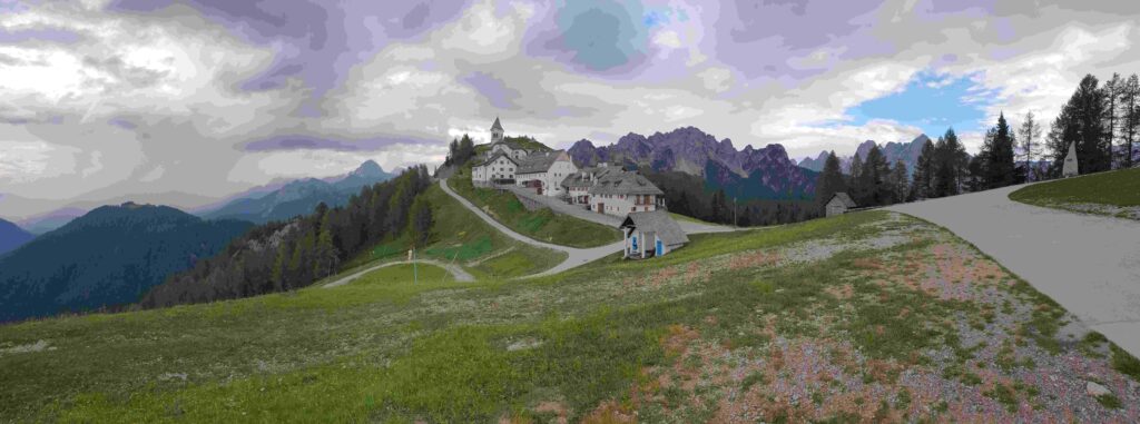 Die Grenze zu Slowenien ist ja nur einen Katzensprung entfernt. Der Countdown läuft, es kann nicht mehr weit sein bis zur Kirche. Wir sind beim letzten von vier Camino Celeste Denkmälern angekommen. Wir fallen uns in die Arme. Tränen fließen. Wir haben es geschafft. Zum Grande Finale fehlen uns aber noch ein paar Meter. Nochmal um eine kleine Bergkupper herum und wir erblicken zuerst die Seilbahn, dann links eine kleine Siedlung mit Gasthäusern, Pfarrgebäuden und der Kirche. Wir gehen in Trance die letzten Meter hinauf. Wir finden keine Worte und gehen gleich in die Kirche. Dort wird gerade ein Gottesdienst für Pilger abgehalten. Das passt ja perfekt für uns. Die Kirche ist voll mit Pilgern, es dürfte eine ganze Gruppe sein. Wir stellen uns ganz nach hinten, Sitzplatz ist keiner frei. Wir stehen in unseren verschwitzten Kleidern in der kalten Kirche und lauschen den Pfarrern. Es sind mehrere vorne am Altar. Die Messe ist natürlich auf italienisch aber das macht nix. Wir gehen sogar zur Kommunion nach vorne. Wir sind ergriffen vom Moment der Ruhe und inneren Einkehr. Nach Ende der Messe gehen wir nach vorne zur Sakristei. Man lässt uns überall einfach durch, unsere großen Rucksäcke sind ein klares Zeichen, was wir hinter uns haben. Wir dürfen sogar in die Sakristei hinein, dort sind 4 Geistliche, 3 Pfarrer und ein Bischof! Alle sind begeistert, dass wir den Cammino Celeste gegangen sind. Sie werden uns in Ihr Abendgebet einschließen. Sogar der Bischof unterhält sich interessiert mit uns. Wir schweben auf Pilgerwolke 7. Den letzten Stempel erhalten wir natürlich auch hier. Ein besonderer Augenblick für uns. Mit gesalbten Kopf und einem geweihten Rucksack verlassen wir die Kirche und eilen zum nächsten Gasthaus. Auf einer Terrasse mit traumhafter Bergkulisse trinken wir ein Bier. Stille auch hier, wir sind einfach fertig, etwas traurig und sehr glücklich. Nach dem notwendigen Bier gehen wir zu unserer Unterkunft, dem Rifugio Locanda Al Convento. Ein altes Gebäude, das wohl mal eine kirchliche Funktion hatte, wie der Name schon sagt. Wir werden von Jure begrüßt, dem Wirt. Einem Slowenen, der seit 20 Jahren hier oben ist. Er ist Wirt mit Leib und Seele. Zudem spielt er auch noch auf seiner Ziehharmonika abends für seine Gäste. Das kommt gut an und bringt Hüttenstimmung. Es gibt gutes regionales Essen, Bier und Wein. Pilgerherz, was willst du mehr? Die Zimmer wurden kürzlich renoviert und waren die schönsten auf unserer ganzen Reise. Wir geniessen den Sonnenuntergang bei einem Spaziergang. Ruhe kehrt ein. Obwohl die Reise jetzt zu Ende ist, grübeln wir, was wir morgen machen werden. Wir sind ja ein paar Tage früher am Ziel als geplant. Es fehlte uns aber eine Idee, denn es ist schwierig die letzten 240 km zu toppen. Danach gibt es nichts höheres. Wir haben alles erledigt.