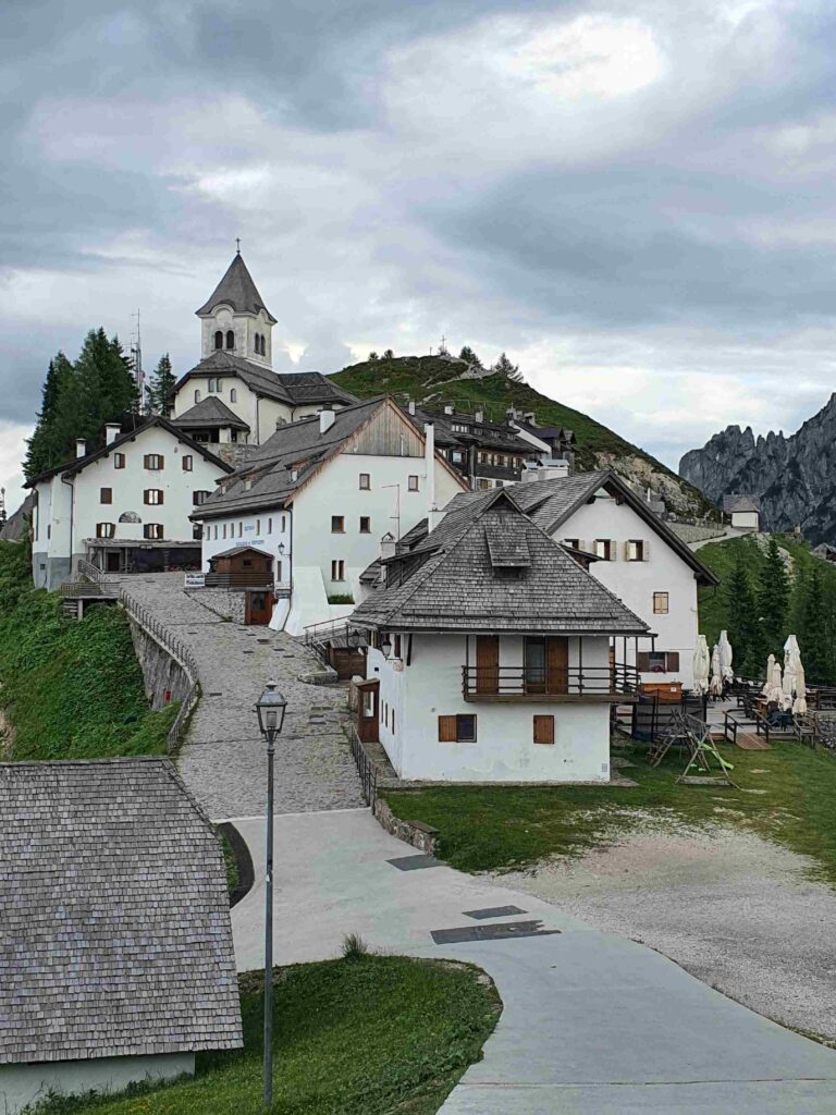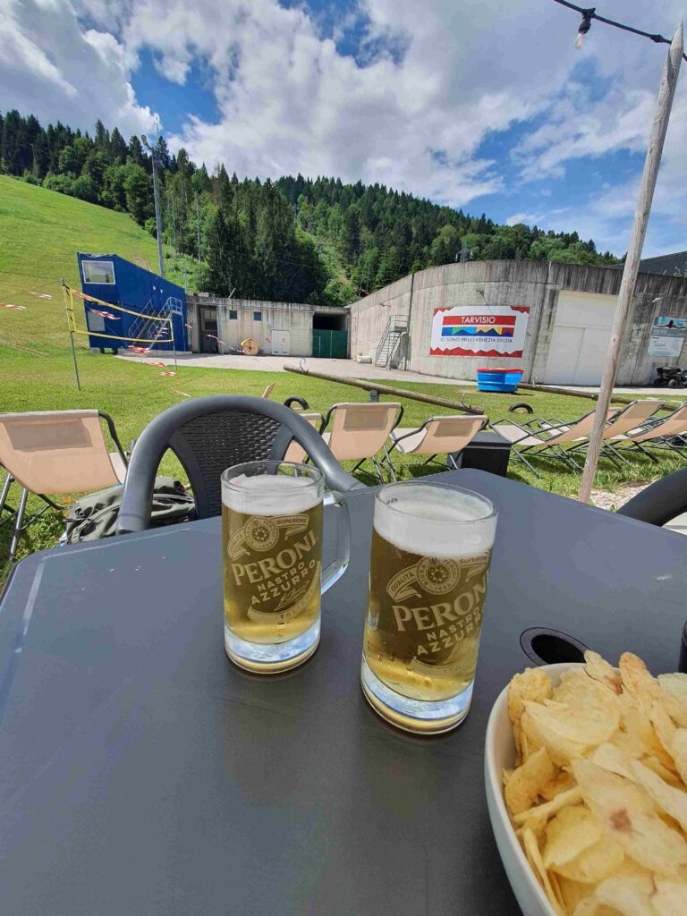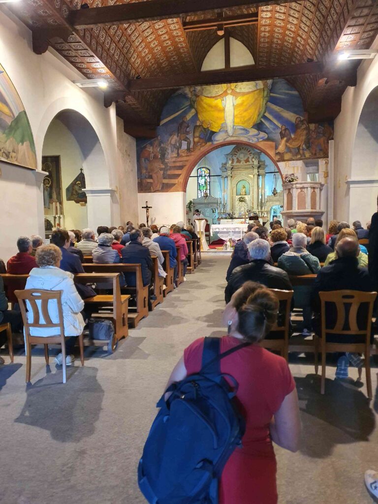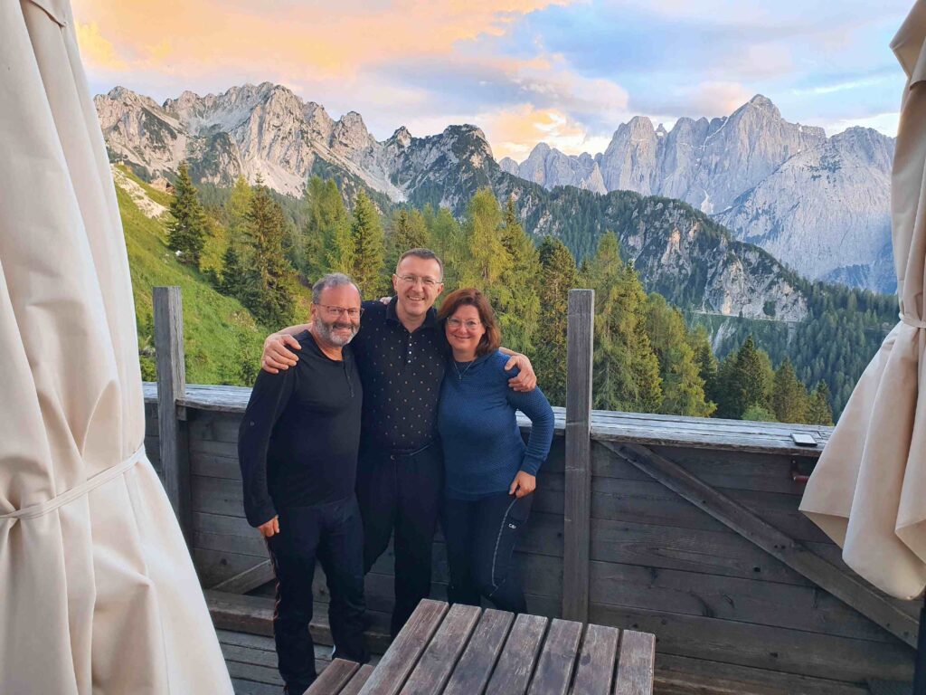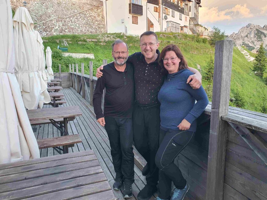 Die Grenze zu Slowenien ist ja nur einen Katzensprung entfernt. Der Countdown läuft, es kann nicht mehr weit sein bis zur Kirche. Wir sind beim letzten von vier Camino Celeste Denkmälern angekommen. Wir fallen uns in die Arme. Tränen fließen. Wir haben es geschafft. Zum Grande Finale fehlen uns aber noch ein paar Meter. Nochmal um eine kleine Bergkupper herum und wir erblicken zuerst die Seilbahn, dann links eine kleine Siedlung mit Gasthäusern, Pfarrgebäuden und der Kirche. Wir gehen in Trance die letzten Meter hinauf. Wir finden keine Worte und gehen gleich in die Kirche. Dort wird gerade ein Gottesdienst für Pilger abgehalten. Das passt ja perfekt für uns. Die Kirche ist voll mit Pilgern, es dürfte eine ganze Gruppe sein. Wir stellen uns ganz nach hinten, Sitzplatz ist keiner frei. Wir stehen in unseren verschwitzten Kleidern in der kalten Kirche und lauschen den Pfarrern. Es sind mehrere vorne am Altar. Die Messe ist natürlich auf italienisch aber das macht nix. Wir gehen sogar zur Kommunion nach vorne. Wir sind ergriffen vom Moment der Ruhe und inneren Einkehr. Nach Ende der Messe gehen wir nach vorne zur Sakristei. Man lässt uns überall einfach durch, unsere großen Rucksäcke sind ein klares Zeichen, was wir hinter uns haben. Wir dürfen sogar in die Sakristei hinein, dort sind 4 Geistliche, 3 Pfarrer und ein Bischof! Alle sind begeistert, dass wir den Cammino Celeste gegangen sind. Sie werden uns in Ihr Abendgebet einschließen. Sogar der Bischof unterhält sich interessiert mit uns. Wir schweben auf Pilgerwolke 7. Den letzten Stempel erhalten wir natürlich auch hier. Ein besonderer Augenblick für uns. Mit gesalbten Kopf und einem geweihten Rucksack verlassen wir die Kirche und eilen zum nächsten Gasthaus. Auf einer Terrasse mit traumhafter Bergkulisse trinken wir ein Bier. Stille auch hier, wir sind einfach fertig, etwas traurig und sehr glücklich. Nach dem notwendigen Bier gehen wir zu unserer Unterkunft, dem Rifugio Locanda Al Convento. Ein altes Gebäude, das wohl mal eine kirchliche Funktion hatte, wie der Name schon sagt. Wir werden von Jure begrüßt, dem Wirt. Einem Slowenen, der seit 20 Jahren hier oben ist. Er ist Wirt mit Leib und Seele. Zudem spielt er auch noch auf seiner Ziehharmonika abends für seine Gäste. Das kommt gut an und bringt Hüttenstimmung. Es gibt gutes regionales Essen, Bier und Wein. Pilgerherz, was willst du mehr? Die Zimmer wurden kürzlich renoviert und waren die schönsten auf unserer ganzen Reise. Wir geniessen den Sonnenuntergang bei einem Spaziergang. Ruhe kehrt ein. Obwohl die Reise jetzt zu Ende ist, grübeln wir, was wir morgen machen werden. Wir sind ja ein paar Tage früher am Ziel als geplant. Es fehlte uns aber eine Idee, denn es ist schwierig die letzten 240 km zu toppen. Danach gibt es nichts höheres. Wir haben alles erledigt.